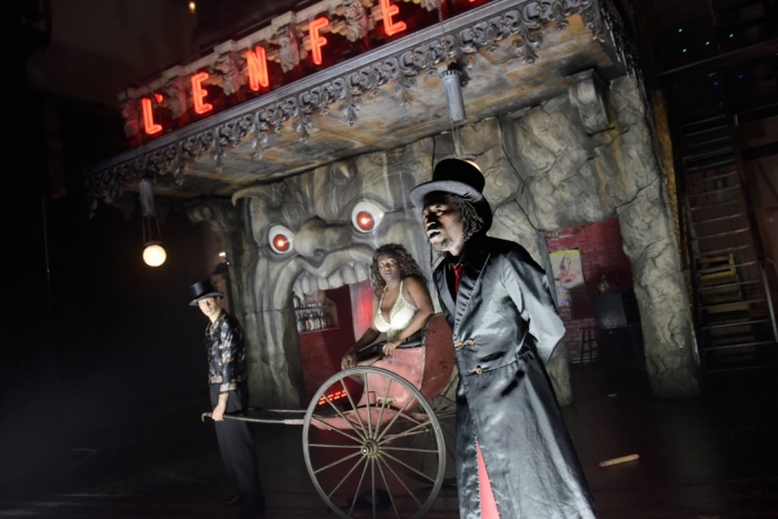 Na sceni je rotirajući objekat sa više ulaza. Još jedno kompleksno djelo scenografa Aleksandra Denića, Kastorfovog stalnog saradnika. S prednje strane, ispod crvenih neonskih slova: L'Enfer, nalazi se ulaz u bar u obliku velike demonske čeljusti, sa isplaženim kamenim jezikom. Sa druge strane su stepenice koje vode u metro stanicu Staljingrad. Naravno, metro stanica je u drugom dijelu zgrade pozorišta i glumci moraju pretrčati (van pogleda gledalaca, podrazumijeva se) tih nekoliko desetina metara da bi stigli na vrijeme da odigraju scenu koju kamere uživo prenose na video-bim. Sa te strane su i stepenice koje vode na krov ove građevine. Iznad njega vidi se splet strujnih kablova. Zgrada je nakićena domorodačkim maskama i plakatima koji reklamiraju kolonijalne proizvode. Tu je i nekoliko postera za horor filmove iz 40-ih i 50-ih, koji kao da upućuju na atmosferu straha od nepoznatog, od stranog, od stranaca. Iznad ekrana na koji se uživo projektuju scene iz unutrašnjosti zgrade, stoji natpis sa slovima u jugendstilu: Exposure Coloniale.